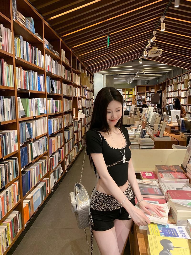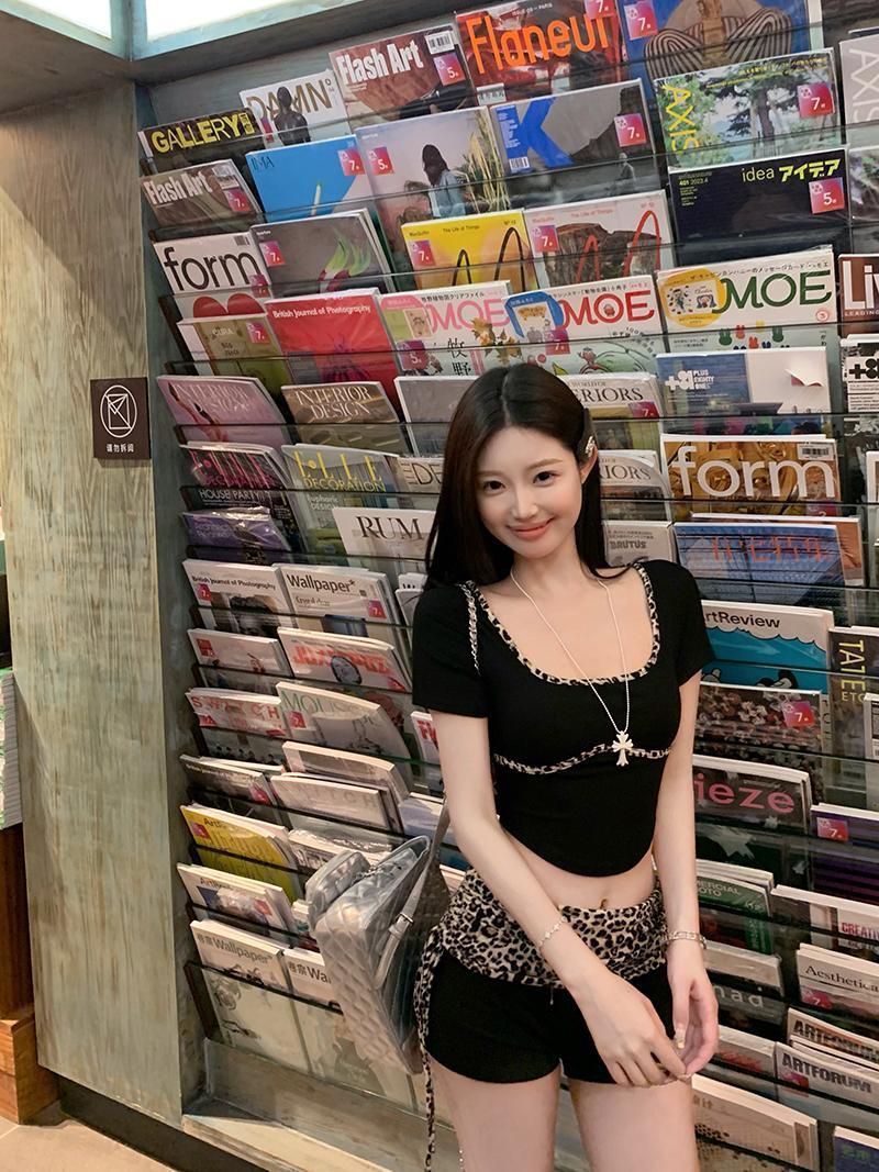 Summer Slimming Sexy Sweet Spicy Leopard Print Patchwork T-Shirt + Low Waist Belted Shorts Two-Piece Set for Women